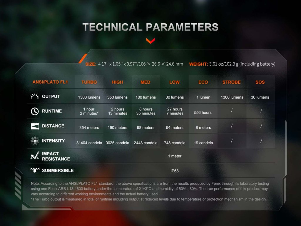 - Svetelný tok a časy výdrže sú merané s nabíjacou Li-ion batériou Fenix 18350 s kapacitou 1600mAh ( súčasťou balenia ).