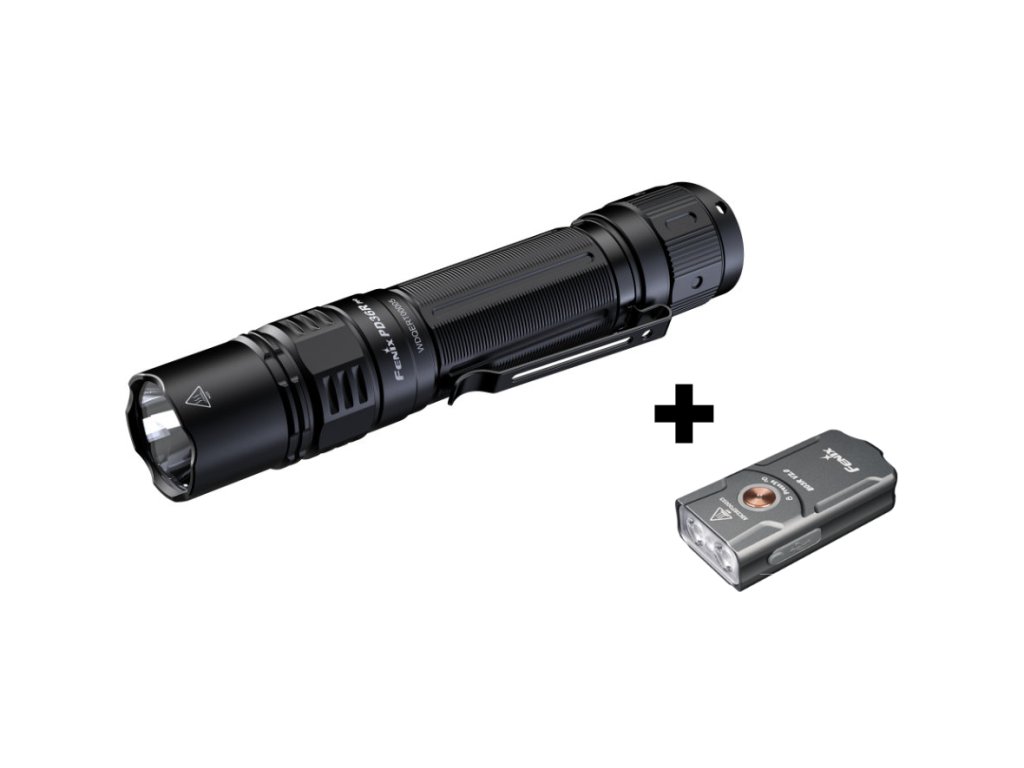 Cenovo zvýhodnená sada svietidla Fenix PD36R PRO a mini baterky Fenix E03R V2.0 v šedej farbe.