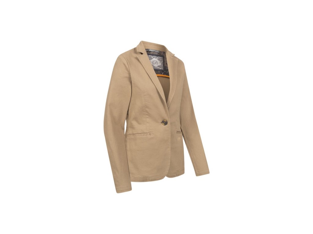 Toto elegantné dámske sako je vyrobené z jednofarebného strečového denimu v tmavom olivovom a pieskovom prevedení. Má zapínanie na gombík a klasický dizajn vreciek, zdobený vyšívaným Blaser argali. Prispôsobený strih dodáva saku športovo-klasický vzhľad, zatiaľ čo veľmi vysoký podiel bavlny umožňuje pohodlné nosenie.