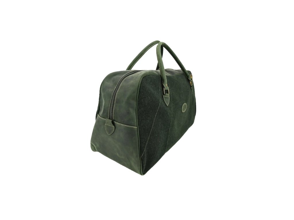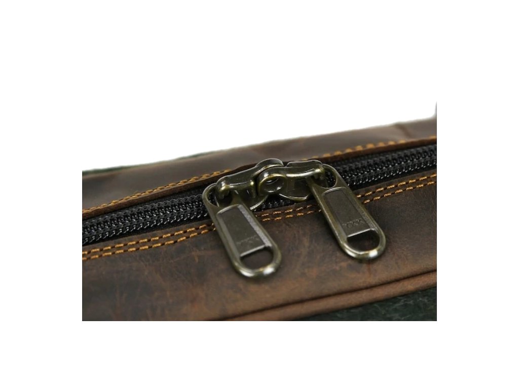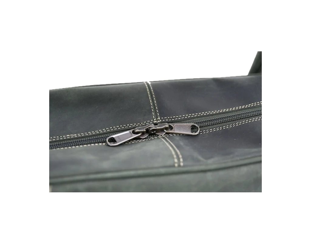 Kožená taška v zelenej koži, s vodeodolnou úpravou, ručne dokončená, do detailov vypracovaná, pevne ušitá. Je kompletne podšitá prateľným priedušným materiálom, s vnútornými vreckami uzavierateľnými na zips a ramenným koženým remeňom.