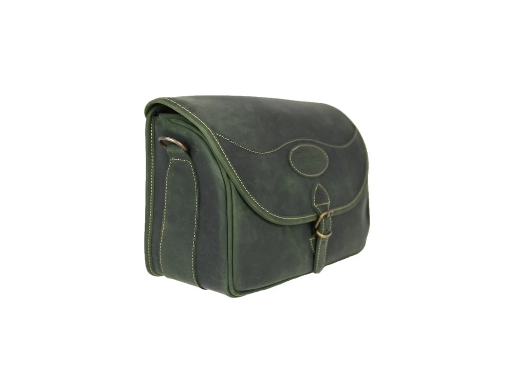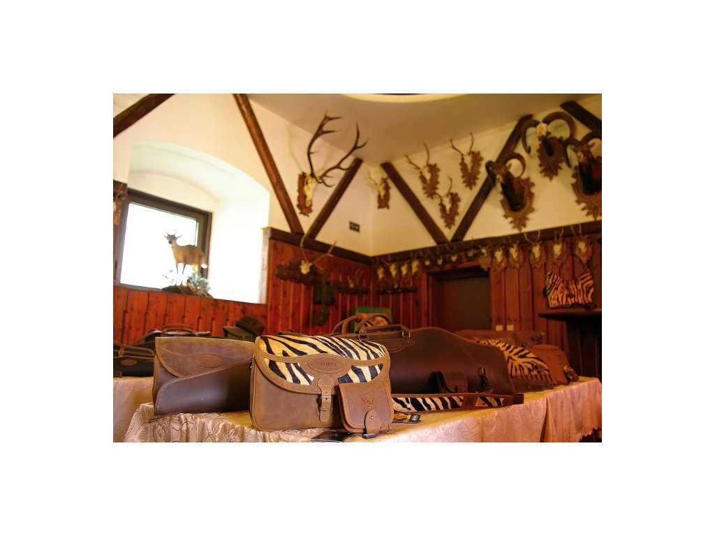 Poľovnícka taška s vodeodolnou úpravou, pevne ušitá, janovský typ. Má kapacitu 100 nebalených komponentov kalib. 12. Obsahuje kožený ramenný popruh.