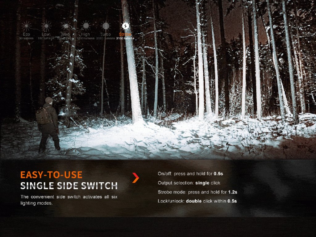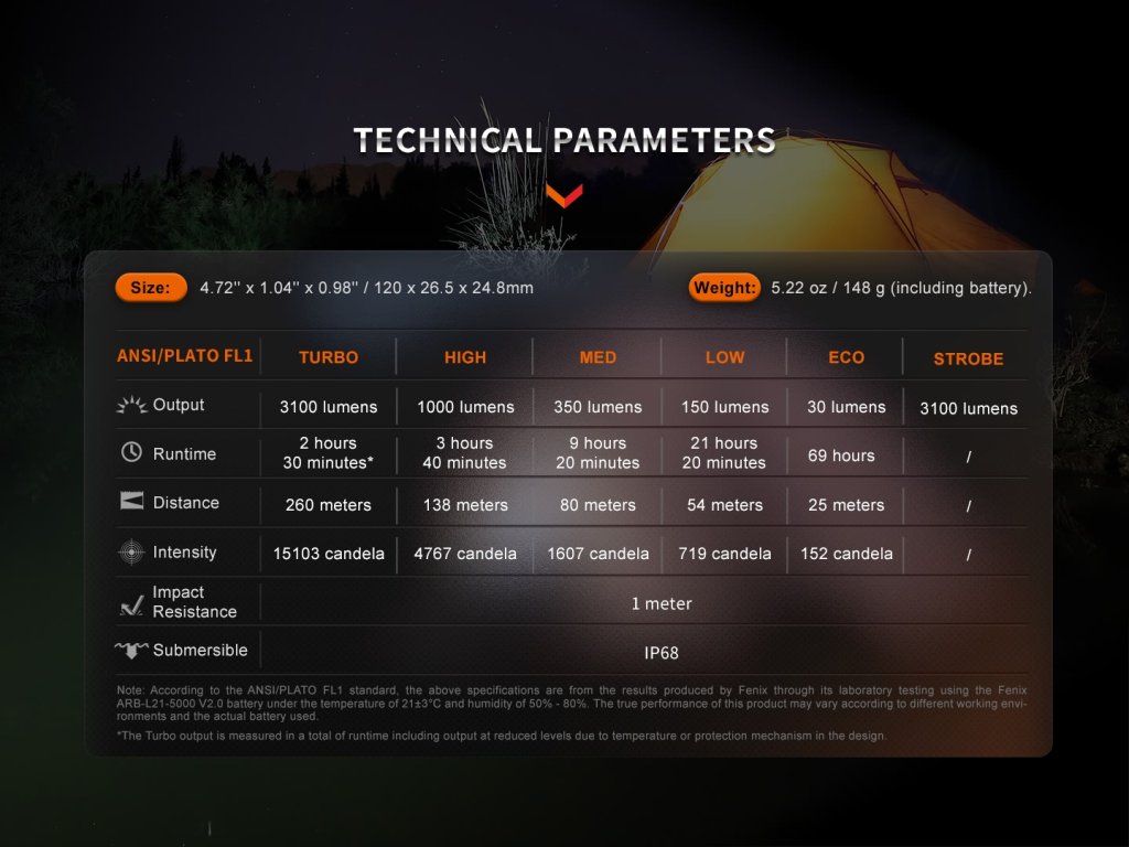 - Šesť režimov výkonu: 3100 lúmenov (2,5 hodiny) -> 1000 lúmenov (3,67 hodiny) -> 350 lúmenov (9,3 hodiny) -> 150 lúmenov (21,3 hodiny) -> 30 lúmenov ( 69 hodín ) - Stroboskop s premenliv.