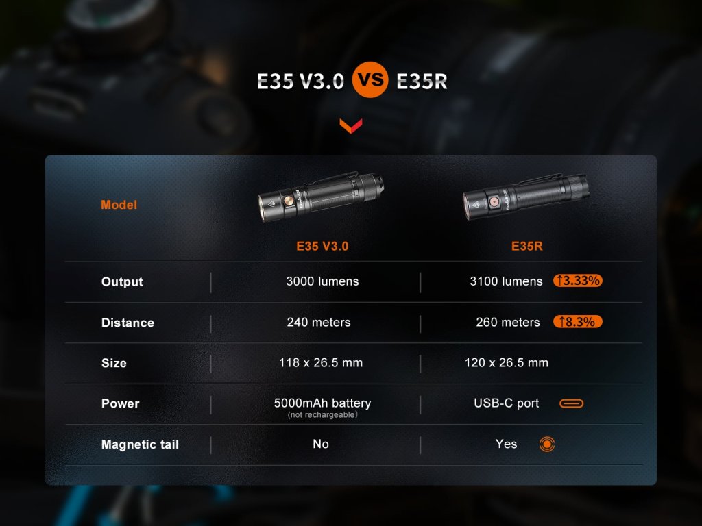Nabíjacie vreckové svietidlo Fenix E35R ponúka svetelný tok až 3100 lúmenov (ANSI) a dosvit až 260 metrov . Výborný výkon bol dosiahnutý použitím modernej LED Luminus SST-70 . Na napájanie slúži vysokokapacitný Li-ion akumulátor typu 21700 s kapacitou 5000 mAh . Jeho dobíjanie sa vykonáva prostredníctvom USB-C konektora na boku svietidla . E35R nahrádza úspešné svietidlo E35 V3.0, proti nej má navyše vstavaný nabíjací konektor a magnetickú koncovku. Svietidlo bolo navrhnuté s ohľadom na jednoduchosť ovládania a širokú použiteľnosť. Šesť svetelných funkcií umožňuje zvoliť medzi vysokým výkonom a výdržou viac ako dva a pol dňa. K dispozícii je aj oslepujúci stroboskop pre núdzové situácie. Fenix E35R je napájaná digitálne kontrolovaným konštantným prúdom pre zaručenie stáleho svetelného výkonu aj pri znižovaní napätia v batériách (pri ich pozvoľnom vybíjaní). Svietidlo je vybavené ultra-tenkým kolimátorom, ktorý je vyrobený pomocou technológií z auto priemyslu. Zapnutie aj prepínanie režimov sa vykonáva tlačidlom ergonomicky umiestnenými na boku. Praktický je magnet v koncovke, svietidlo je možné prichytiť na železné predmety. Toto svietidlo je ideálnym svetelným nástrojom s vynikajúcim pomerom vysokého výkonu, kvality a ceny. Je možné ju odporučiť pre široké spektrum outdoorových, športových, pracovných i profesionálnych aktivít.