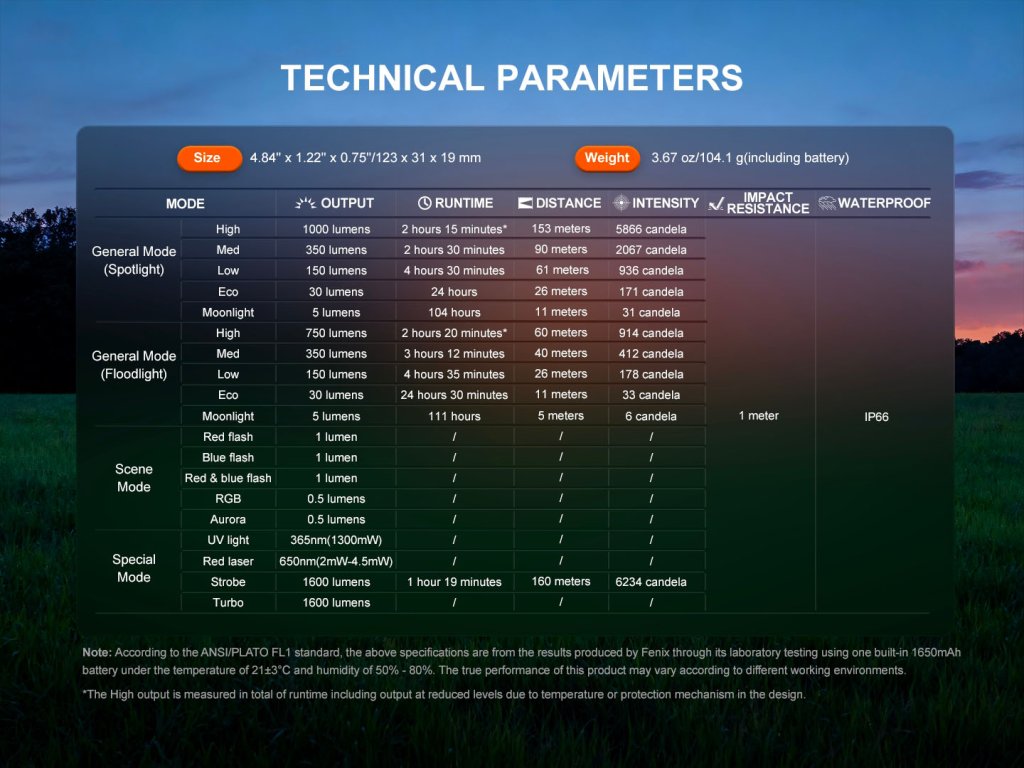 Všetky parametre svietidla (svetelný tok, doba prevádzky na batérie, vodoodolnosť, nárazuvzdornosť a dosvit) sú zmerané v súlade s normou ANSI/NEMA FL 1-2009.