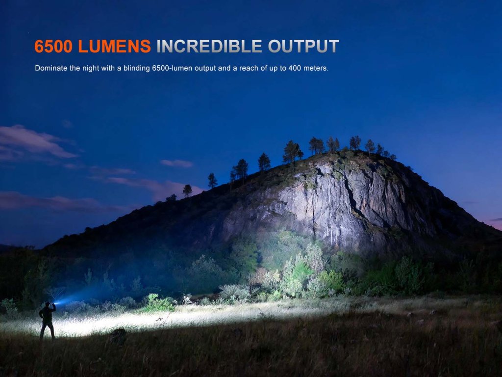 - Šesť režimov bieleho svetla: 6500 lúmenov (3,3 hodiny) -> 2000 lúmenov (4 hodiny) -> 800 lúmenov (4,6 hodiny) -> 150 lúmenov (31,5 hodiny) -> 30 lúmenov (102 hodín) -> stroboskop 3000 lúmenov