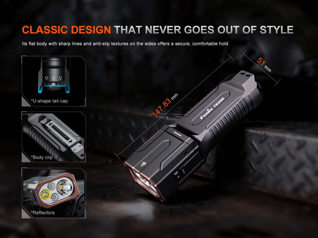 Fenix TK28R je extra výkonné svietidlo TK série a poskytne vám svetelný výkon až 6500 lúmenov (ANSI) a schopnosť prerezať tmu na vzdialenosť až 400 metrov. Za touto impozantnou silou stojí unikátna kombinácia širokého a diaľkového reflektora s dvoma výkonnými LED Luminus SST-70 a SFT-70. Okrem oslnivého bieleho svetla je TK28R vybavená aj silným červeným svetlom s výkonom až 260 lúmenov. Energiu dodáva dvojica robustných akumulátorov typu 18650, každý s kapacitou 4000 mAh (sú súčasťou balenia), ktoré pohodlne dobijete priamo v svietidle prostredníctvom moderného USB-C konektora. Ovládanie je intuitívne a bleskurýchle vďaka taktickému spínaču a inovatívnej prepínacej páčke FlexiSensa control. Tá umožňuje nielen uzamknutie svietidla proti nechcenej aktivácii, ale aj voľbu medzi bielym a červeným svetlom. Potrebujete maximálnu výdrž? Na najnižšom režime vám TK28R posvieti až 102 hodín. Plochý dizajn vďaka obdĺžnikovej hlave a batériám uloženým vedľa seba zaručuje, že svietidlo neprekáža vo vrecku, na opasku ani v batohu, perfektne sedí v dlani a umožňuje pevný úchop. Jej robustná, vodotesná konštrukcia (IP68) je navrhnutá tak, aby odolala aj tým najtvrdším podmienkam, od prietrže mračien po extrémne nasadenie. Či už ste členom bezpečnostných zložiek, zúčastňujete sa na záchranných misiách, venujete sa poľovníctvu alebo hľadáte nekompromisného spoločníka pre svoje outdoorové dobrodružstvá, Fenix TK28R je pripravená prekonať vaše očakávania.