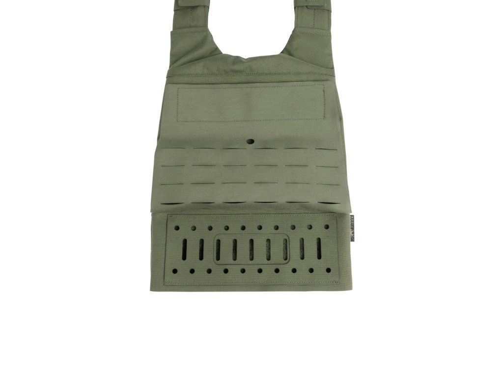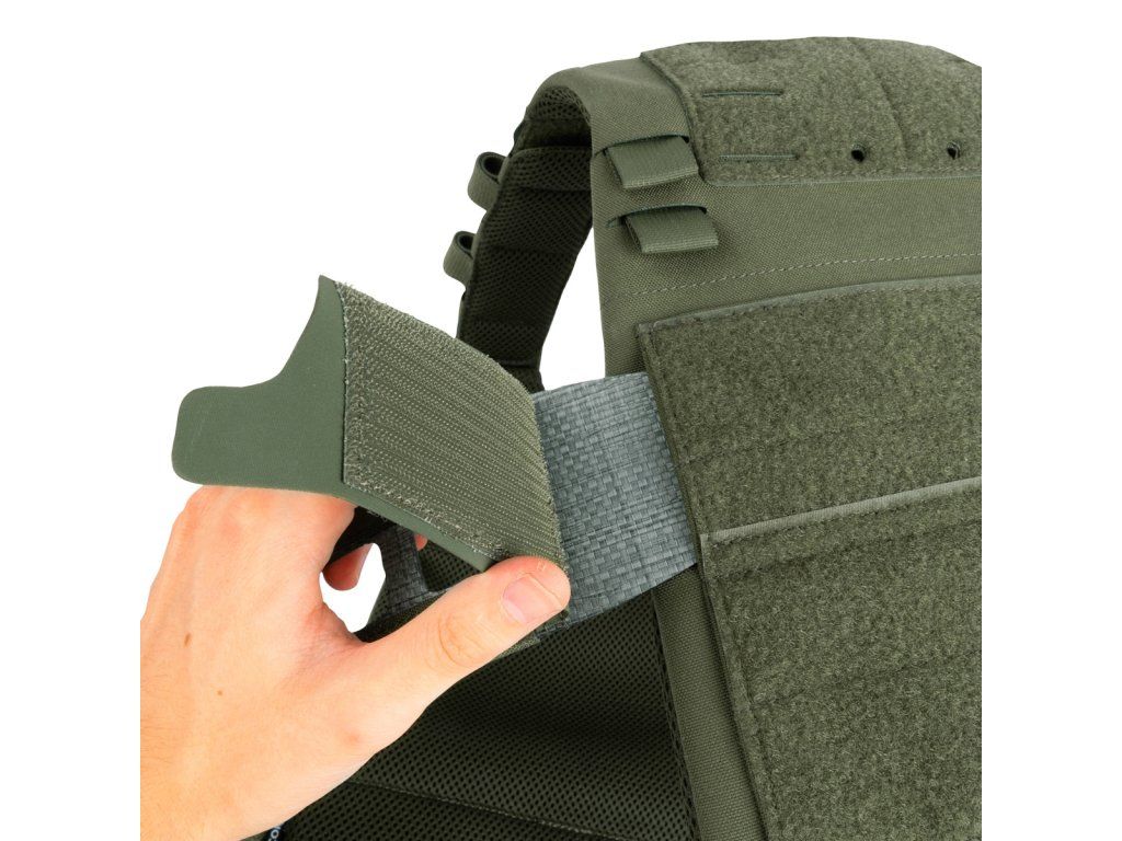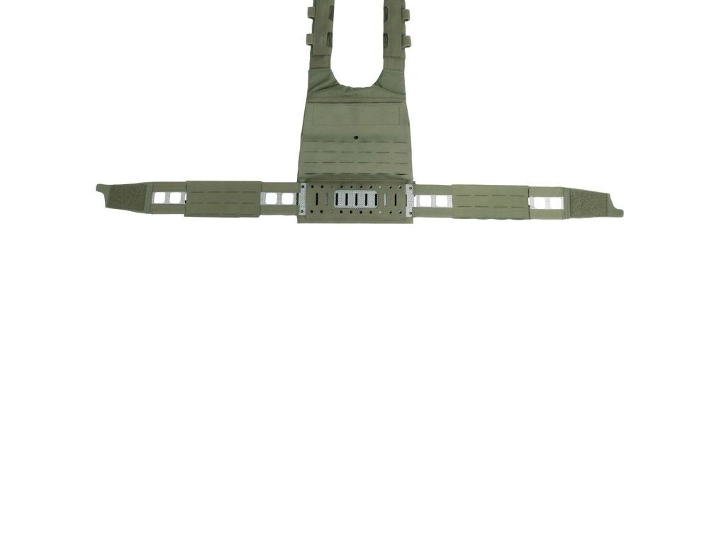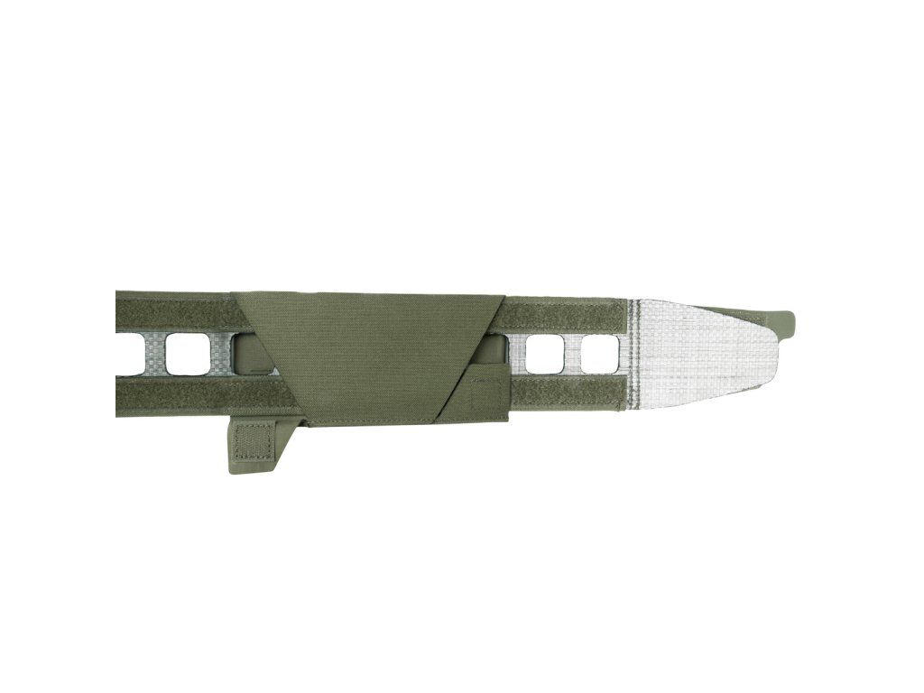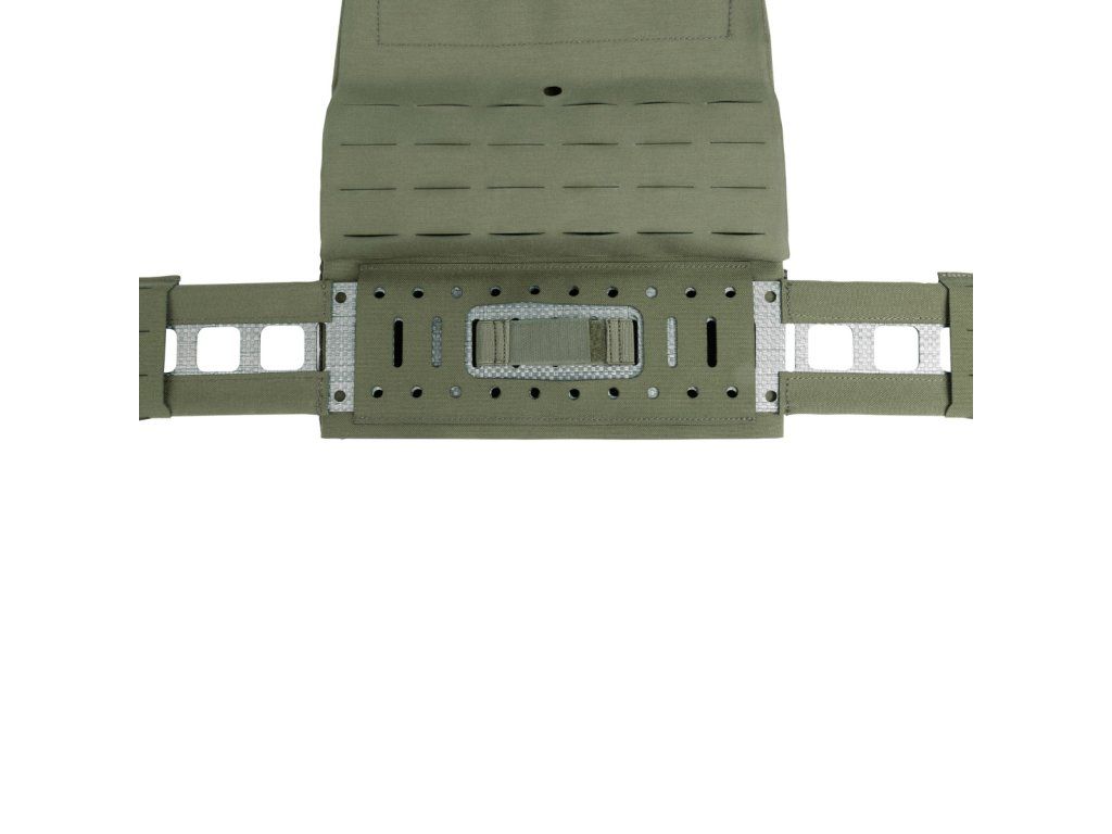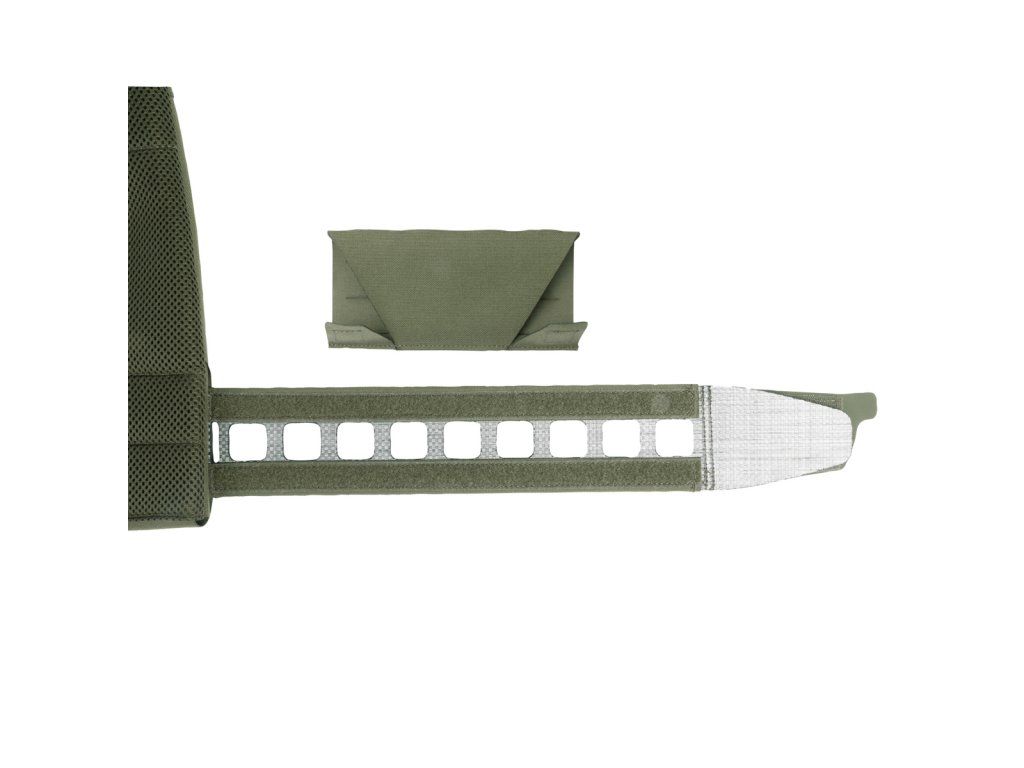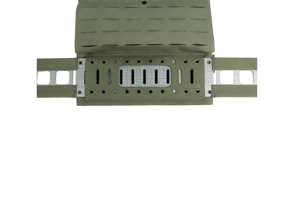 Vďaka bočnému pásu (cummerbund) vystuženému materiálom Tegris® je tento nosič plátov mimoriadne ľahký, no zároveň si zachováva vysokú stabilitu. Bočný pás je vybavený laserom vyrezávanými otvormi s MOLLE rozostupom a v prednej časti ho možno výškovo zafixovať do dvoch rôznych polôh. Maximálnu voľnosť pohybu a individuálne nastavenie dĺžky zabezpečuje elastický upínací prvok umiestnený priamo na bočnom páse. Súčasťou je aj odnímateľný plochý MOLLE panel, ktorý umožňuje rýchlu konfiguráciu alebo operatívne zhodenie nesenej výstroje podľa potreby.
