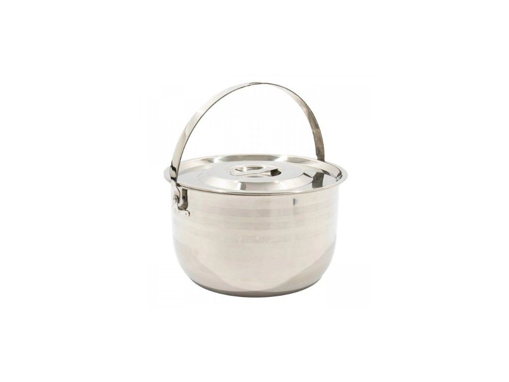 Kotlík s pokrievkou a sklopným uchom na zavesenie nad oheň. Nerezová oceľ je vysoko kvalitný materiál na prípravu potravín. Je zdravotne nezávadná, odolná proti oderu a veľmi jednoducho sa udržuje aj pri veľkom zašpinení dymom z ohňa.