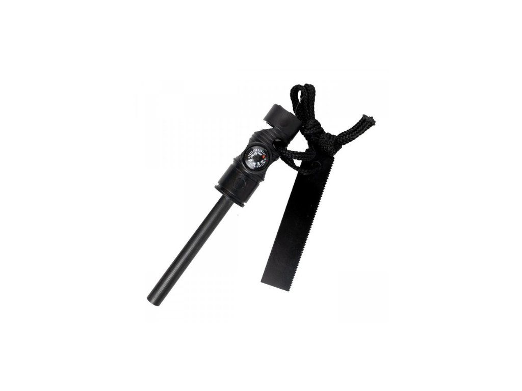 Pomôcka 3v1 na prežitie v prírode. kresadlo vyrába veľké iskry a rýchlo zapáli suchú trávu alebo trúd. Kompas na orientáciu v teréne a píšťalka na privolanie pomoci. Pred prvým použitím je nutné z tyčky škrtadlom zoškrabať čiernu farbu.