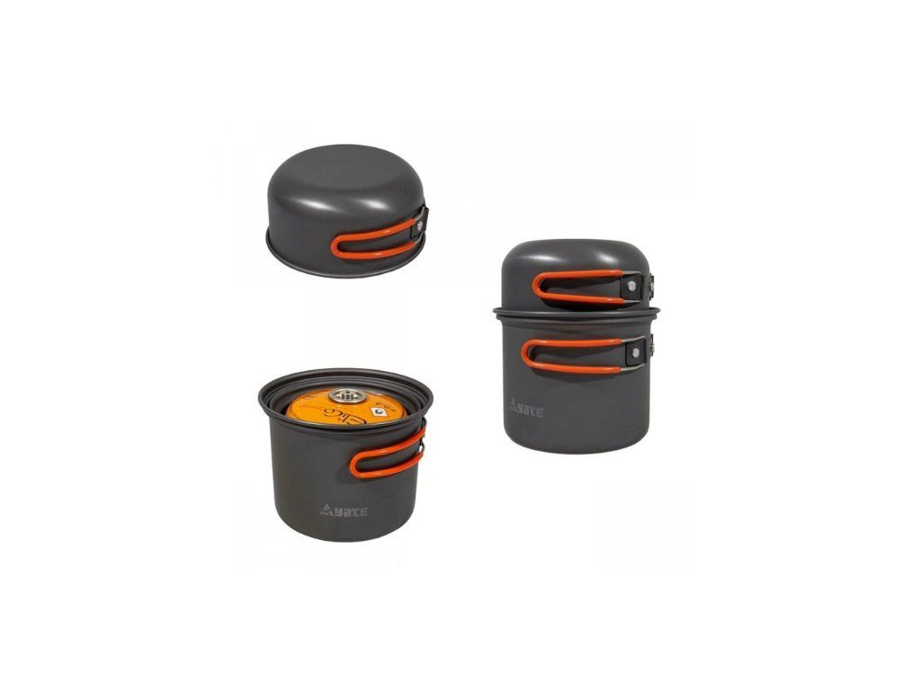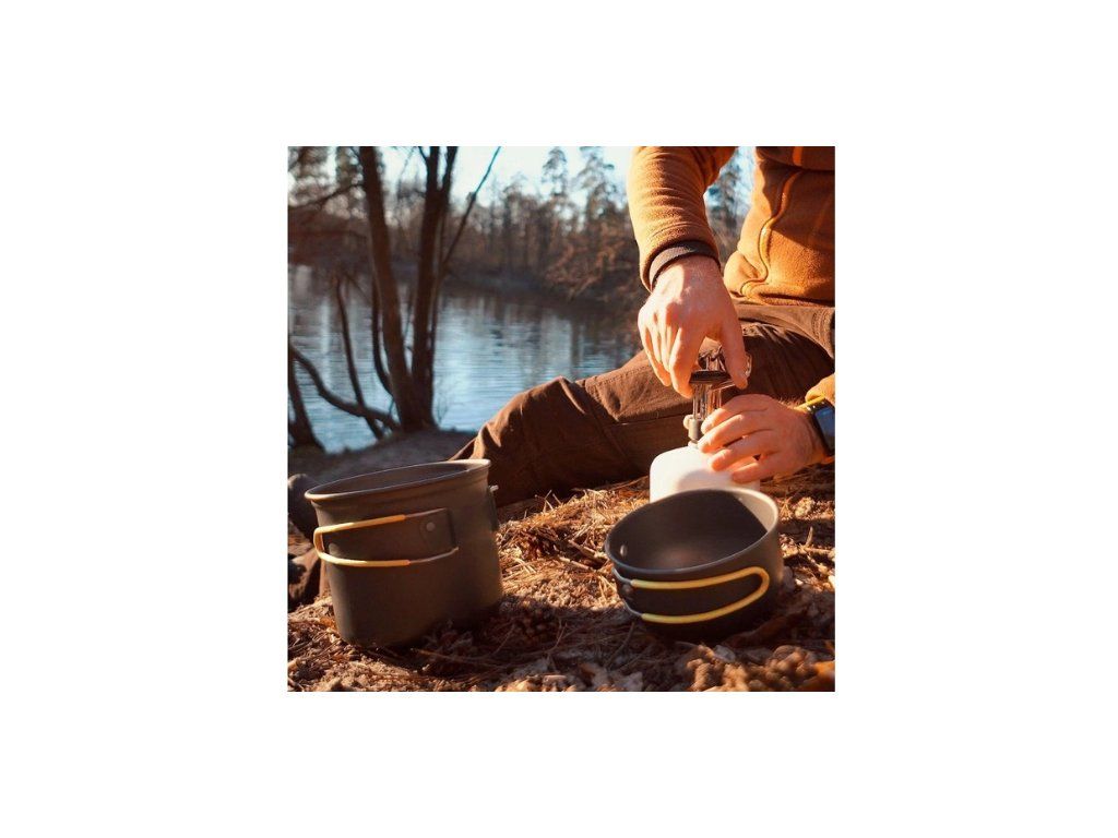 Súprava riadu pre 1-2 osoby z eloxovaného potravinárskeho hliníka, ktorý je odolný proti oderu. Držadlá sú chránené silikónom proti popáleniu a sú príjemné do ruky. Dodávané vrátane prepravného obalu. Veľmi ľahká a kompaktná. Do hrnca sa pohodlne zmestí kartuša na plyn (300 aj 500g) a varič.